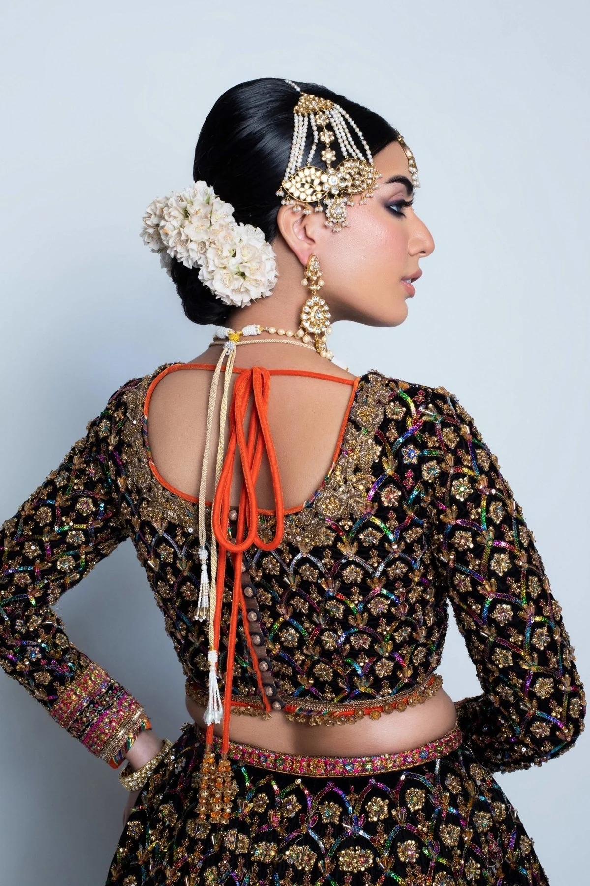 FahadHussayn presents a breathtaking black Lehnga Choli embellished with colorful different-sized crystals. It is adorned with very fine hand and zari work paired with an equally phenomenal dupatta.