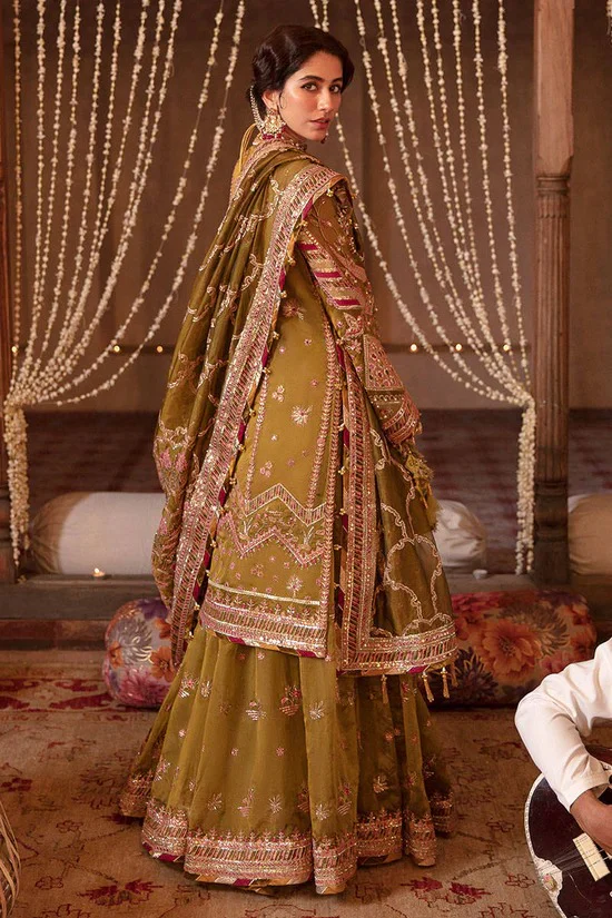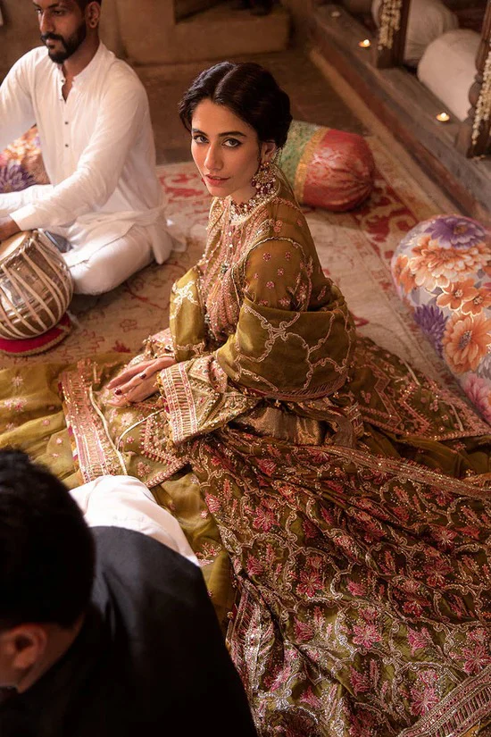 IQBAL BANO is a dhaani green gharara and shirt ensemble. The shirt is packed with floral motifs and studded with fine gold sequin work; this dreamy green color serves as a breath of fresh air. The gharara adorned with floral butti’s sprayed all across and an intricate border along the hem exudes youthful vibes. It is paired with a coordinating dupatta in matching color that features a delicate jaali/lattice and is adorned with elegant border that is bound to make a resounding statement.