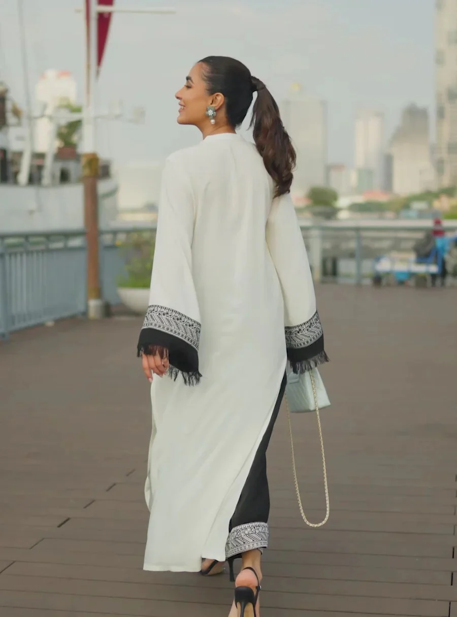 Embrace effortless summer style with our ‘Ivory Joy Set.’ Crafted from luxuriously soft viscose fabric, this piece offers a lightweight and breathable feel, perfect for the warmer days ahead. The pristine ivory hue serves as a canvas for intricate black embroidery, adding a touch of artisanal sophistication. Delicate detailing adorns the neckline, sleeves, and hem, creating a striking contrast and elevating the overall design.