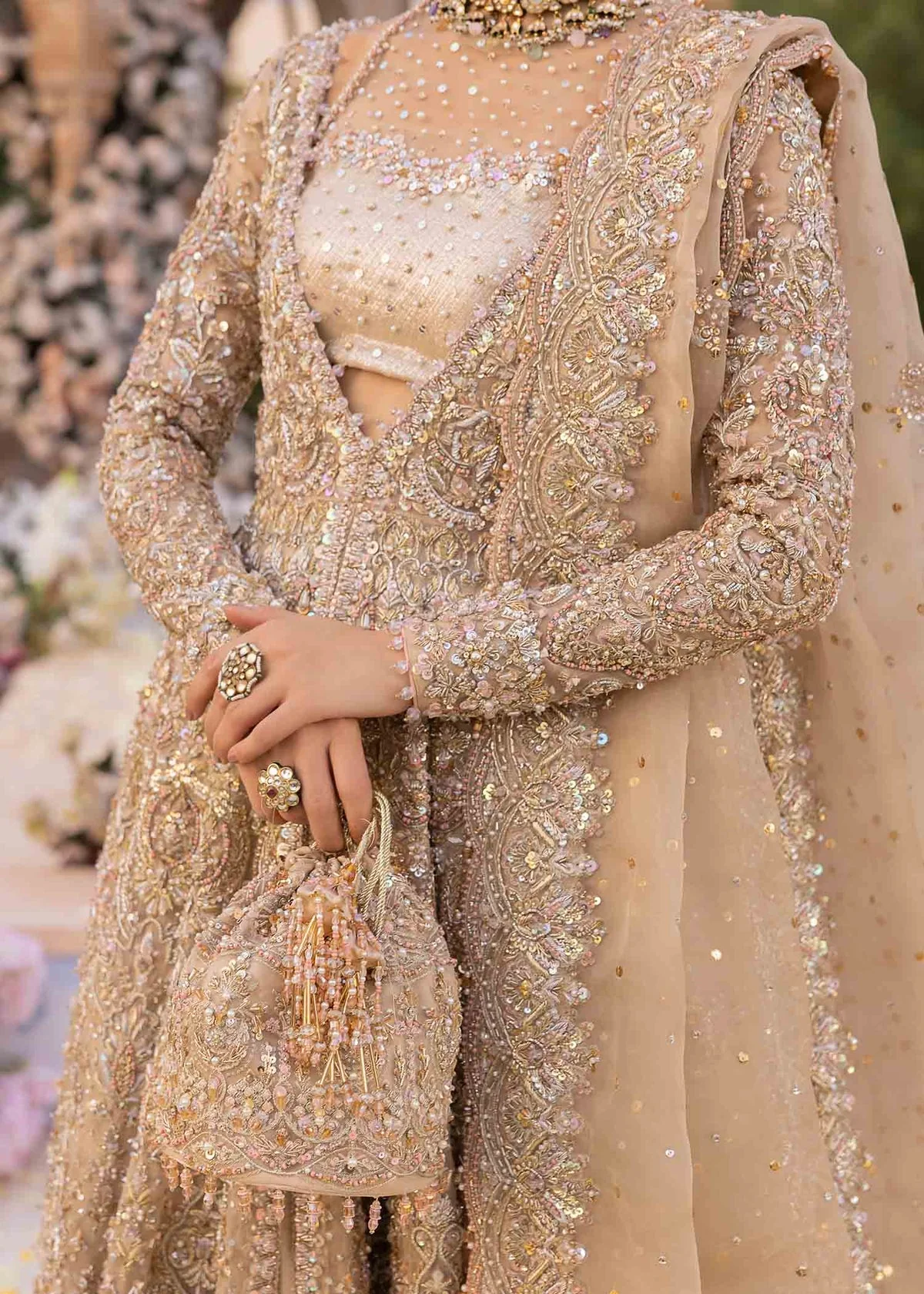 The Nude Organza Pishwas is an exquisite bridal attire that blends traditional and experimental features. The organza Pishwas’ neutral hue gives a delicate glamour tone, while the experimental material adds a contemporary touch. It’s an expression of individuality and classic romance, allowing the