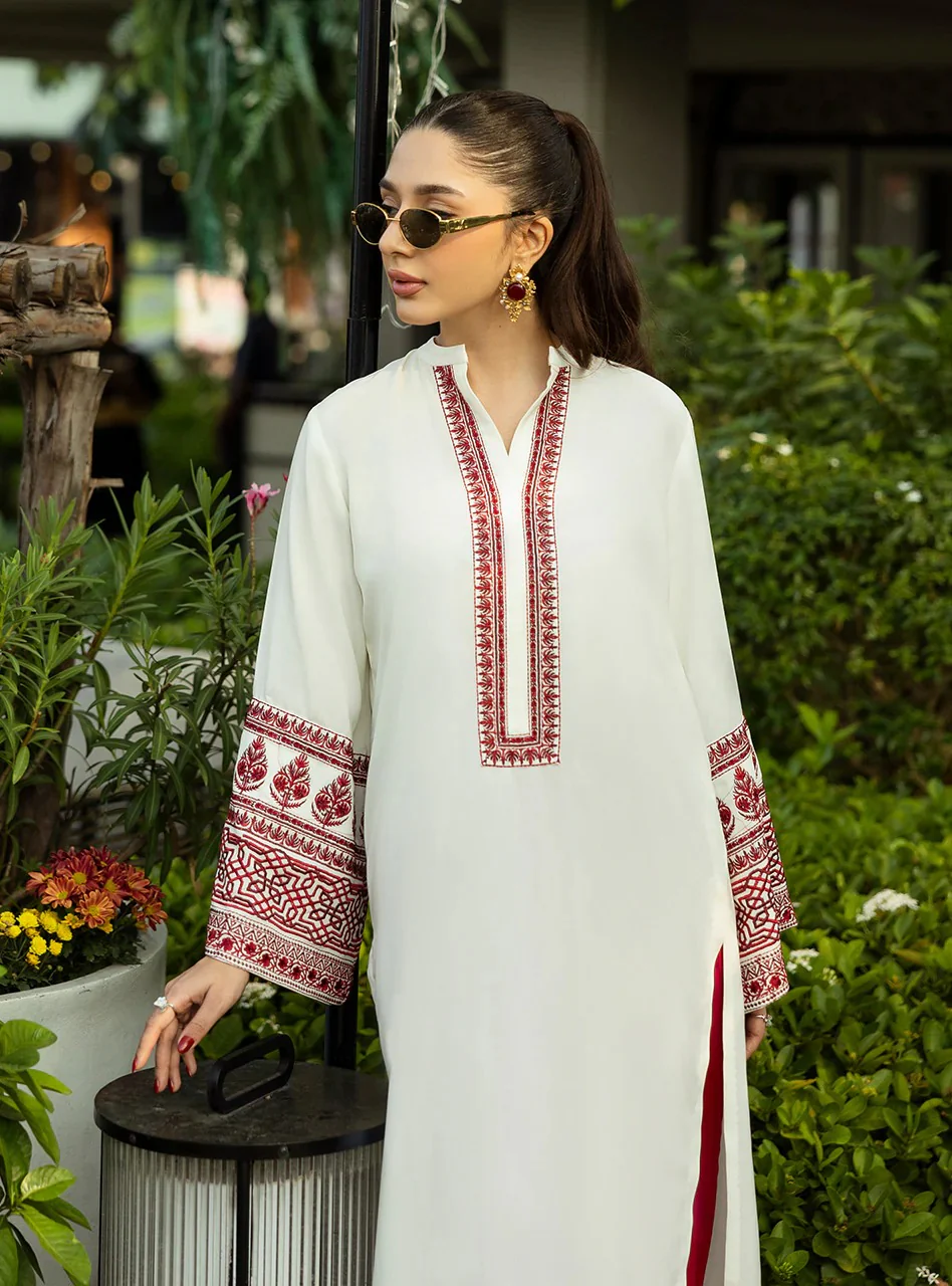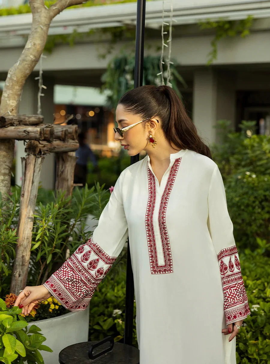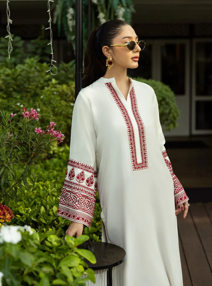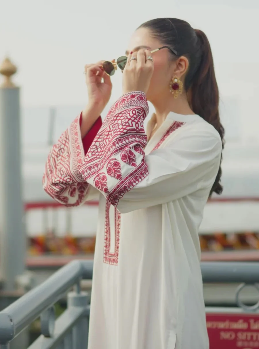 This elegant two-piece set features a pristine white viscose kurta, offering a cool and breathable feel, perfect for the warmer days. The focal point is the exquisite crimson embroidery, meticulously crafted along the neckline, sleeves, and hem. Paired with crimson pants, with delicate white embroidery to complete the look.